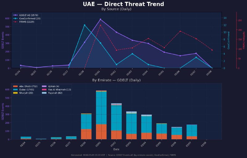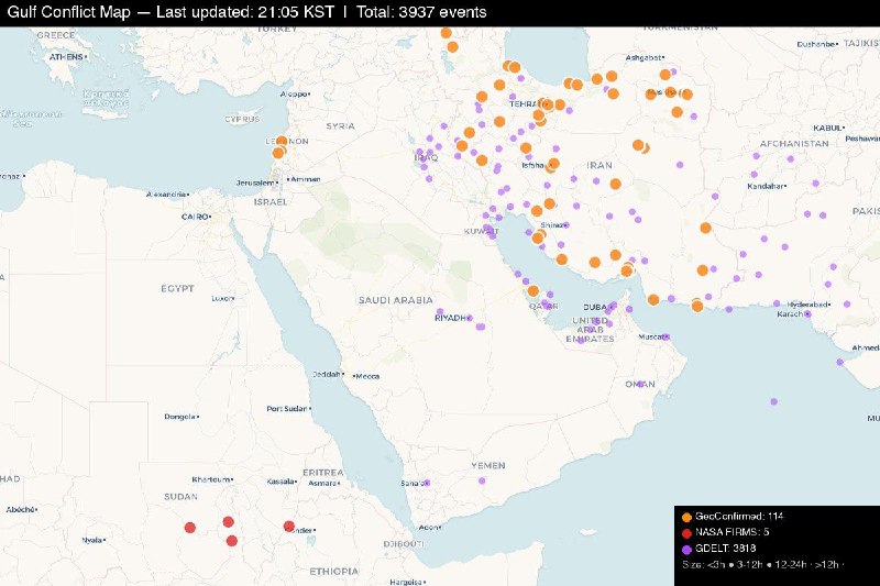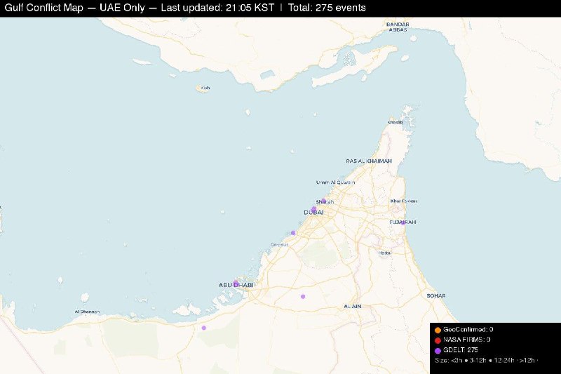그 이후 제온이는 스스로 전쟁 정보를 체계화하고 있었다. 어느새 속보만 쏟아지던 채널에는 여섯 장의 카드가 10분 간격으로 정리되어 올라온다. 전황 브리핑과 리스크 스코어, 걸프 지역 분쟁 시계열 차트, UAE 직접 위협 추이, 중동 전체 분쟁 지도, UAE 줌인 지도, 호르무즈 해협 항공 현황 등.