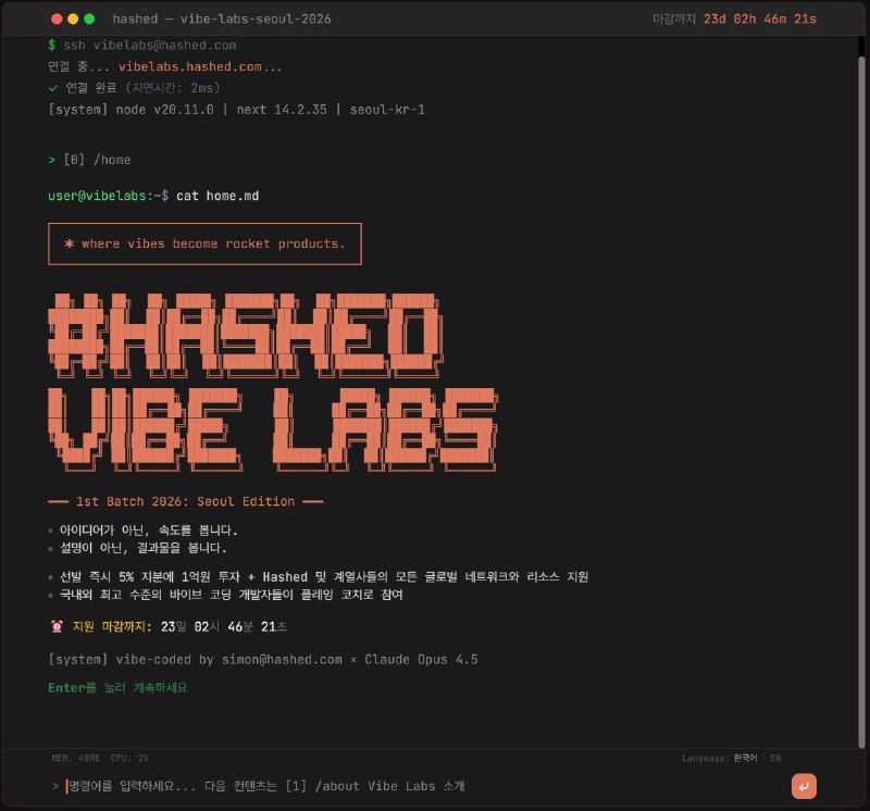 그렇게 두어 시간을 더 허비하고 새벽 1시쯤이 되어서야 깨달았다. 문제는 일반적인 퀄리티가 아니었다. AI와 함께하는 바이브 코딩 시대에 매끈한 랜딩 페이지는 누구나 만든다. 우리가 런칭하려는 건 "새로운 시대의 빌더를 위한 프로그램"인데, 누구나 만들 수 있는 양산형 사이트로 그들을 맞이하는 게 옳은가? 방향을 완전히 틀었다. 보편적인 GUI를 버리고 투박한 터미널로 돌아가기로 했다. 검은 화면에 깜빡이는 커서, "MEM: 48MB", "CPU: 2%" 같은 시스템 리소스 텍스트. 명령어를 입력해야만 비로소 정보를 뱉어내는 CLI 인터페이스. 어떤 인터페이스로 숨겨진 재미를 줄지, 인터랙션의 템포는 어떻게 조절할지. 매끈함 대신 디테일과 씨름했다.